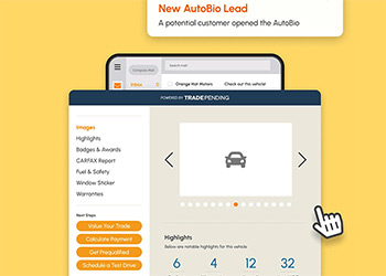 Sales enablement that puts your customers first. AutoBio presents all the necessary vehicle information in one spot: CARFAX or AutoCheck, service records, window sticker, market data, keeping people engaged with your dealership. TradePending alerts your team when a previous lead re-engages with the AutoBio report, whether their first contact was 3 days or 3 months ago. AutoBio keeps customers engaged with all the infomation they need, and makes every sales person instant vehicle expert and skilled communicator.